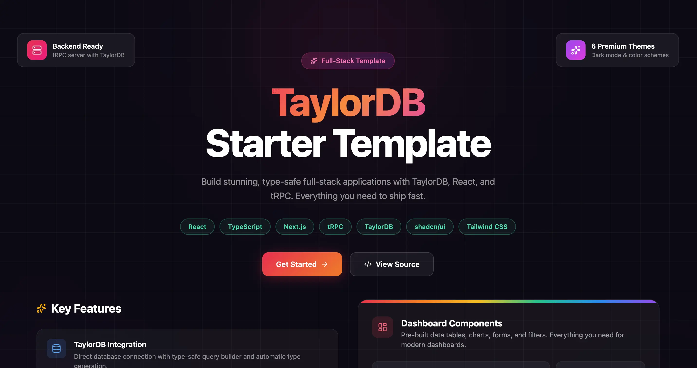 A Next.js 16 full-stack starter with tRPC, TaylorDB, React Query, and Tailwind CSS — type-safe from database to UI, ready to clone and ship.