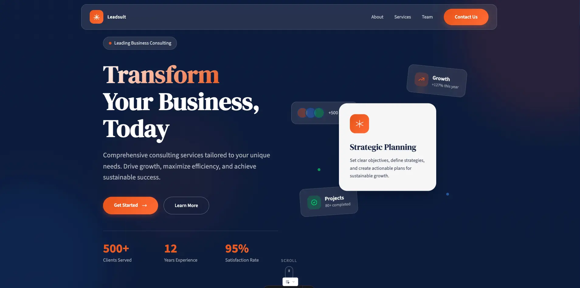 A clean, modern business consulting website template — fully responsive across all devices, with sections for services, team, client logos, testimonials, and a working contact form. Ready to customize with your own brand and content.
